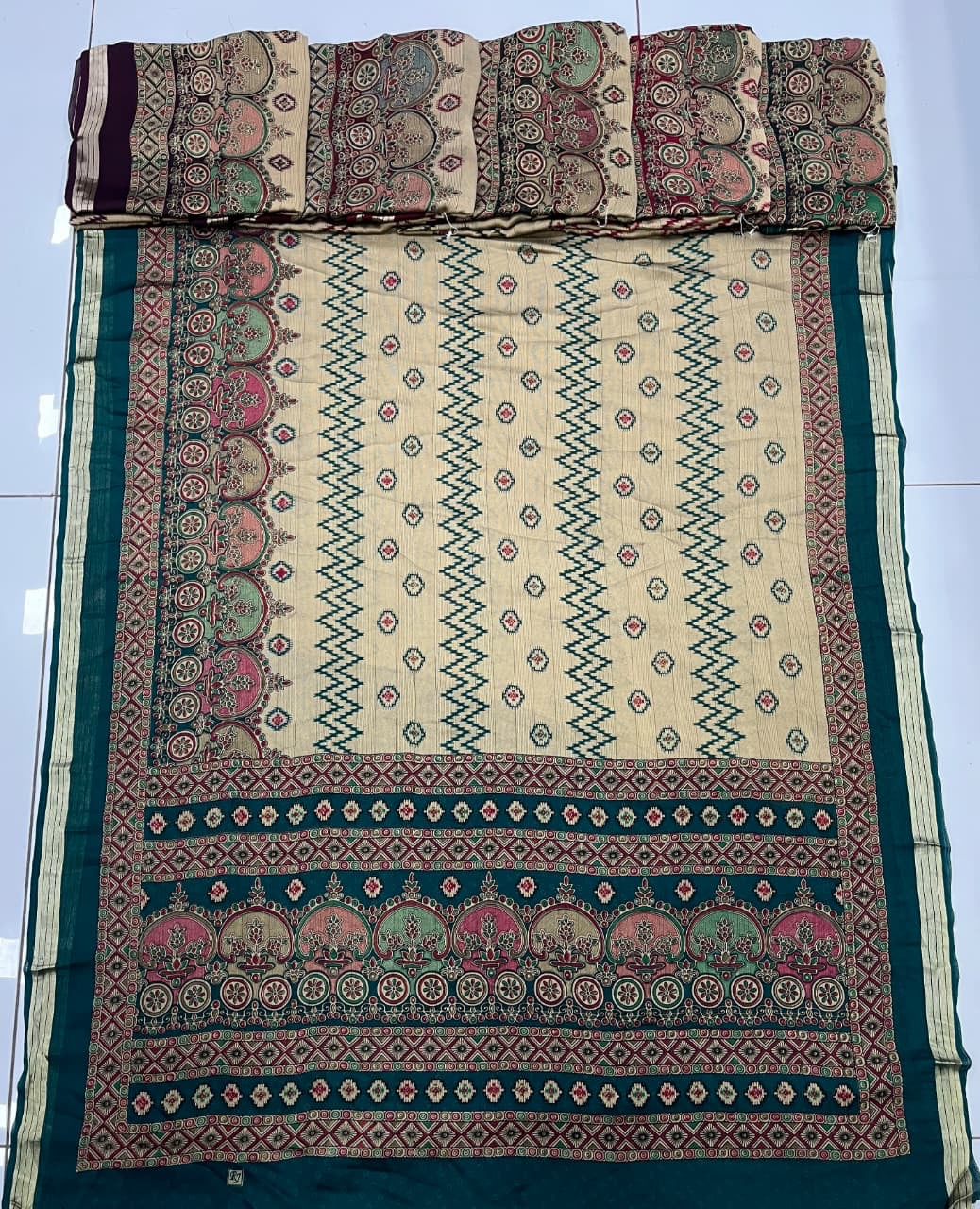 The beige base is adorned with maroon and multi-colour traditional prints featuring geometric and paisley patterns. A rich maroon border with intricate motifs enhances the elegance and gives it a classic finish.