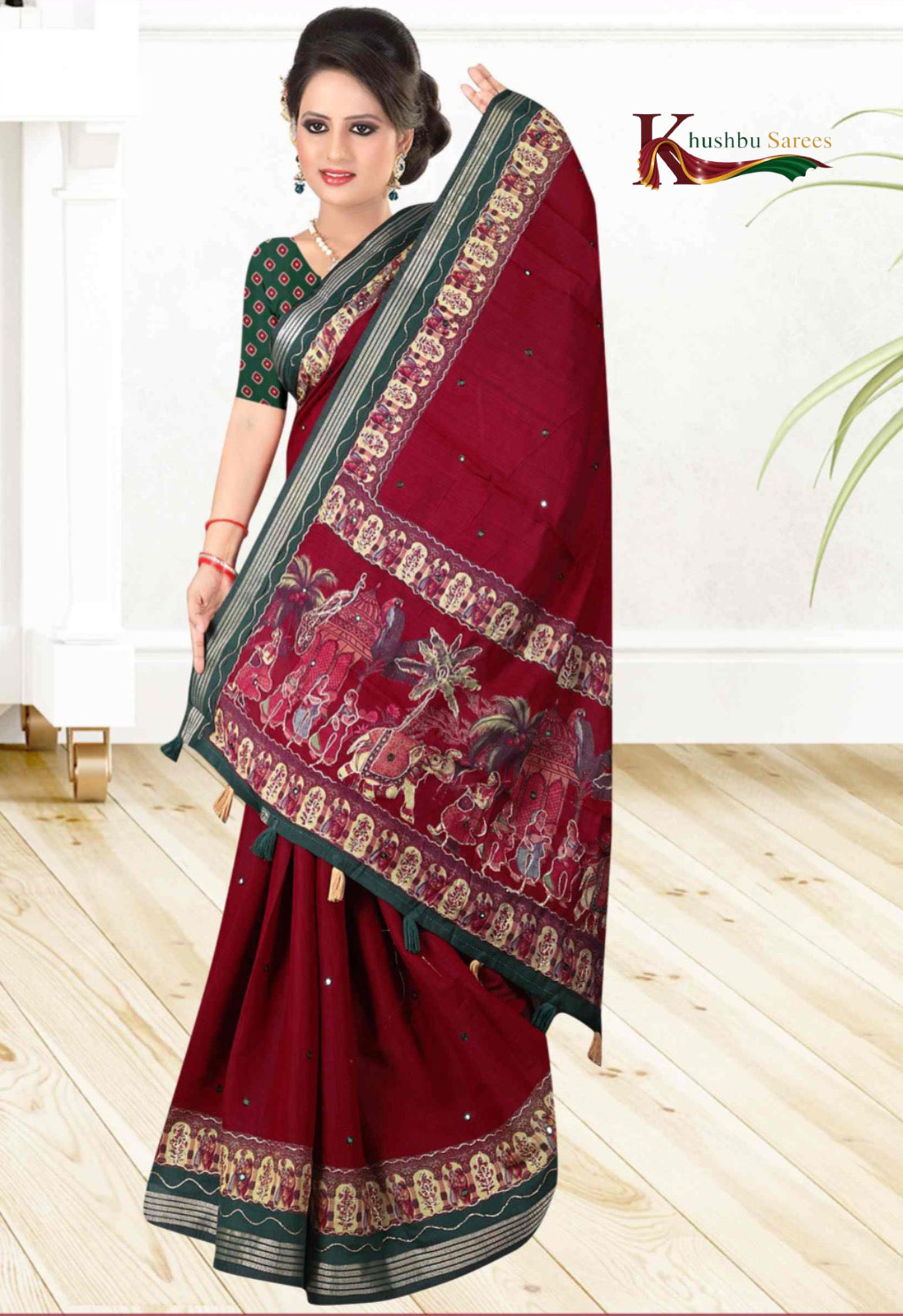 Khushbu Sarees Bottle Green Cotan Saree with Maroon Border & Festival Print